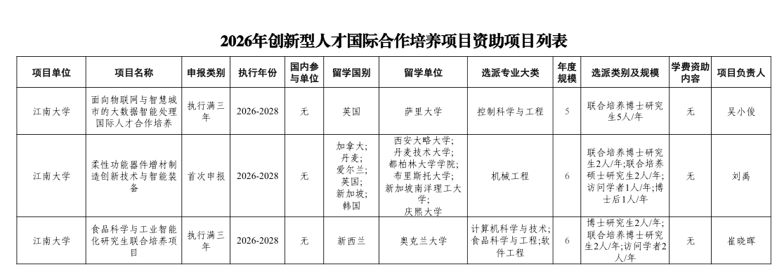 近日,国家留学基金管理委员会(CSC)正式公布2026年创新型人才国际合作培养项目立项资助名单,我校机械学院牵头申报的“柔性功能器件增材制造创新技术与智能装备”项目成功获批,执行期为3年。与此同时,我校人工智能与计算机学院牵头申报的“面向物联网与智慧城市的大数据智能处理国际人才合作培养”项目和“食品科学与工业智能化研究生联合培养”项目,因近三年执行成效显著、人才培养质量突出,获批继续执行。